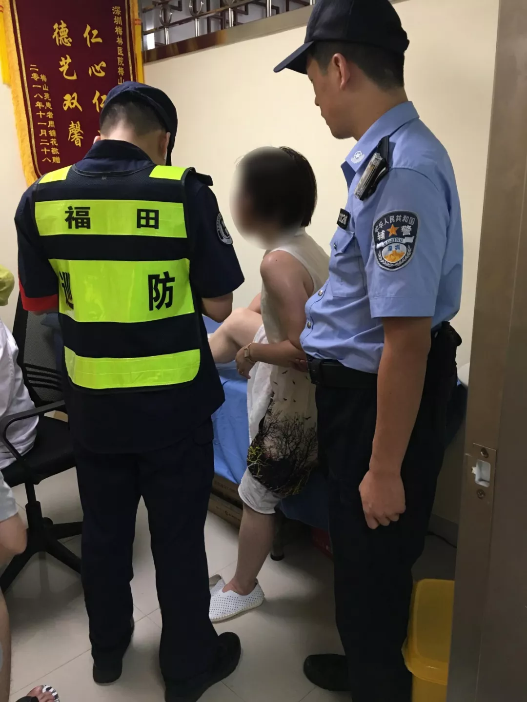 7月1日晚,梅林派出所輔警劉建勇與其隊員在步巡時,突然聽到求助聲,回頭一看,一位女士正坐在草坪上表情痛苦地朝他們招手。了解到求助者韋小姐因運動把腳踝扭傷,又沒帶鑰匙、手機,無法回家、聯(lián)系親友,劉建勇便背上韋小姐在兩名隊員的幫助下奔往就近的社康中心。因傷勢較重,劉建勇與隊員在韋小姐的委托下,替她取來手機與錢包,并將其送往北大醫(yī)院就診,待韋女士朋友趕來才離開。