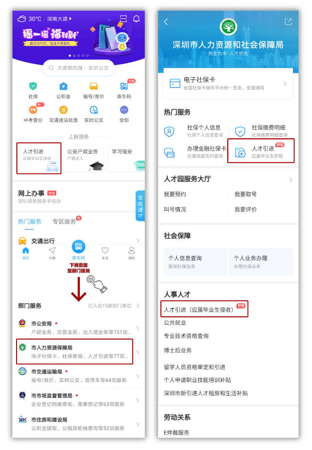 在“i深圳”APP首頁下拉至“部門服務(wù)”列表,進入深圳市人力資源保障局專區(qū),然后選擇“人才引進”。