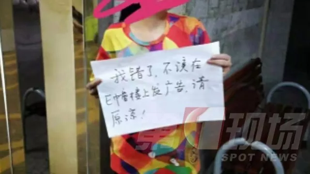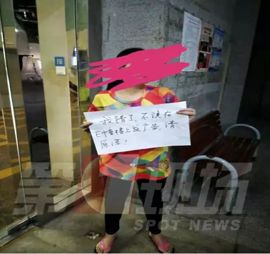 ▲女子手持道歉牌,上面寫著:“我錯了,不應該在E棟樓上發(fā)廣告,請原諒”