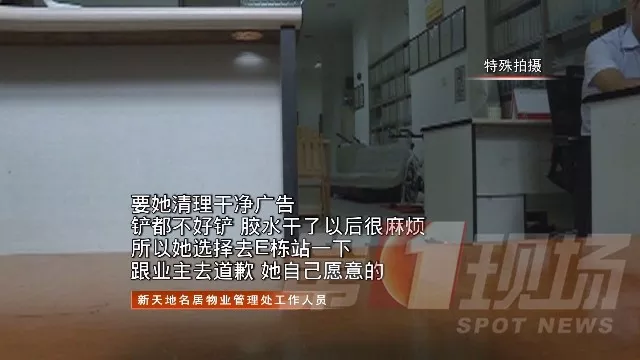 當時這名女子在小區(qū)E棟樓層里張貼小廣告,物業(yè)發(fā)現(xiàn)后把她帶到管理處,要求她自行清理掉自己張貼的所有廣告,或者道歉,二者選其一。
