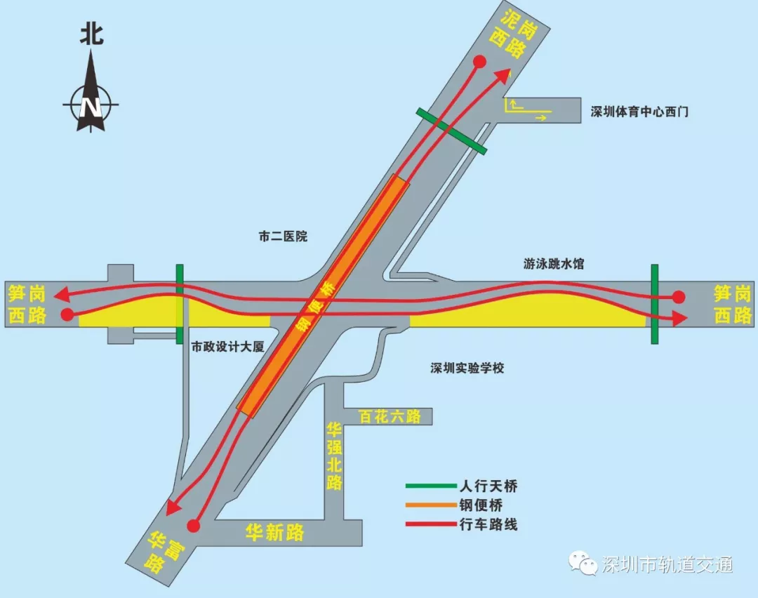 南北向:華富路—泥崗西路取消原通過平交路口的車道,轉(zhuǎn)為通過上鋼便橋?qū)崿F(xiàn)自南向北通行;東西向:筍崗西路東西向直行交通保持不變,取消原平交路口的紅綠燈。(詳見圖3)