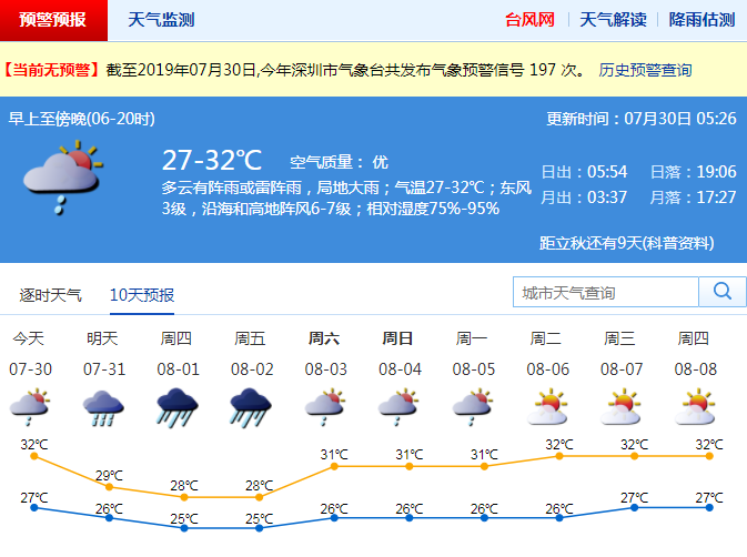 深圳今天多云有雷陣雨 8月1-2日有暴雨