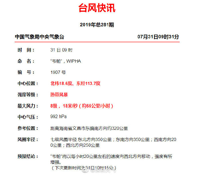 氣象部門預(yù)計,未來24小時內(nèi)“韋帕”將以每小時15公里-20公里的速度向西北方向移動,強(qiáng)度略有加強(qiáng),將于8月1日早晨到上午,在茂名電白到海南瓊海一帶沿海地區(qū)登陸,正面襲擊雷州半島。登陸后將穿過雷州半島,移入北部灣。