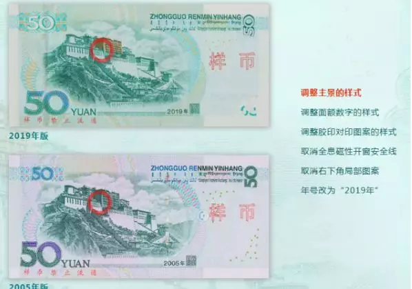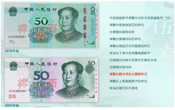 2019年版第五套人民幣50元、20元、10元、1元紙幣分別保持2005年版第五套人民幣50元、20元、10元紙幣和1999年版第五套人民幣1元紙幣規(guī)格、主圖案、主色調(diào)、“中國人民銀行”行名、國徽、盲文面額標(biāo)記、漢語拼音行名、民族文字等要素不變,提高了票面色彩鮮亮度,優(yōu)化了票面結(jié)構(gòu)層次與效果,提升了整體防偽性能。2019年版第五套人民幣50元、20元、10元、1元紙幣調(diào)整正面毛澤東頭像、裝飾團(tuán)花、橫號(hào)碼、背面主景和正背面面額數(shù)字的樣式,增加正面左側(cè)裝飾紋樣,取消正面右側(cè)凹印手感線和背面右下角局部圖案,票面年號(hào)改為“2019年”。