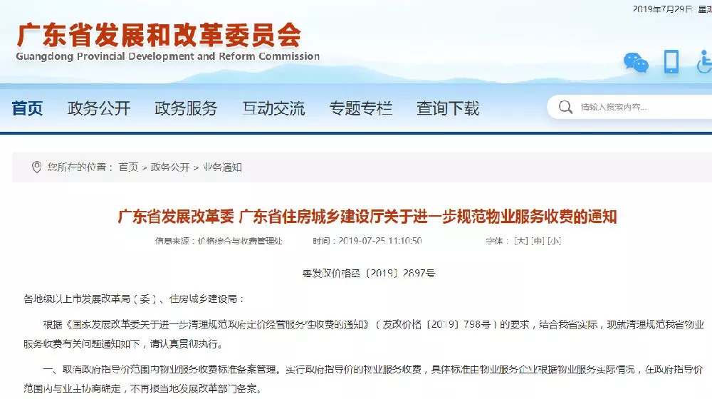 廣東省物業(yè)服務收費規(guī)范新規(guī)定自2019年8月1日起執(zhí)行。實行政府指導價的物業(yè)服務收費,具體標準由物業(yè)服務企業(yè)根據(jù)物業(yè)服務實際情況,在政府指導價范圍內與業(yè)主協(xié)商確定,不再報當?shù)匕l(fā)展改革部門備案。