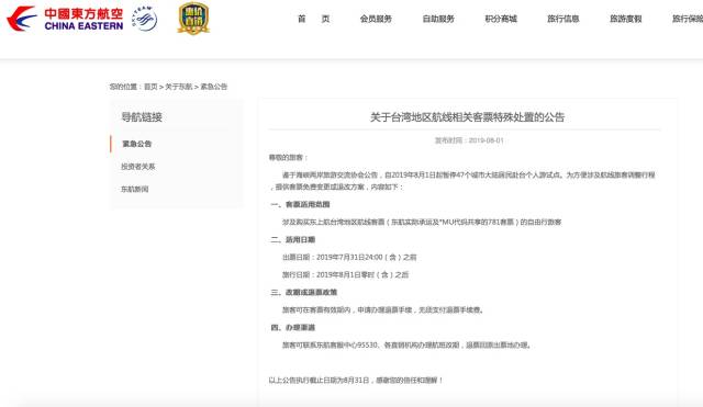 繼深航之后,東航也剛剛發(fā)布了關(guān)于臺(tái)灣地區(qū)航線相關(guān)客票特殊處置的公告:涉及購(gòu)買(mǎi)東航臺(tái)灣地區(qū)航線客票(東航實(shí)際承運(yùn)及*MU代碼共享的781客票)的自由行旅客,出票日期在2019年7月31日24:00(含)之前,旅行日期在2019年8月1日零時(shí)(含)之后的,旅客可在客票有效期內(nèi),申請(qǐng)辦理退票手續(xù),無(wú)須支付退票手續(xù)費(fèi)。