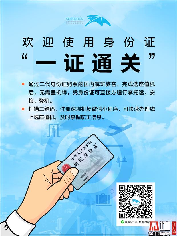 深圳新聞網(wǎng)2019年8月1日訊(見圳客戶端、深圳新聞網(wǎng)記者 涂勝 通訊員 葉丹)記者從深圳機(jī)場(chǎng)了解到,即日起,深圳機(jī)場(chǎng)全面試行國(guó)內(nèi)航班身份證“一證通關(guān)”服務(wù)。今后,使用二代身份證購(gòu)買機(jī)票的旅客,在完成選座值機(jī)后,僅需出示身份證即可直接辦理行李托運(yùn)、安檢和登機(jī)手續(xù),全程無需再出示登機(jī)牌。