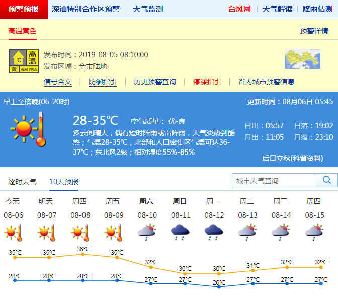 最新的氣象預(yù)報(bào)顯示,未來(lái)4-5天,深圳持續(xù)高溫天氣。8月6-9日受副熱帶高壓和臺(tái)風(fēng)“利奇馬”偏北下沉氣流的影響,深圳市以晴天為主,高溫天氣持續(xù),大部分地區(qū)最高氣溫34-36度,中北部和人口密集區(qū)可達(dá)37度或以上;10-11日轉(zhuǎn)雷陣雨。