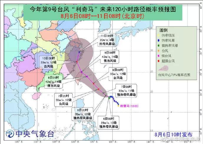預(yù)計(jì),“利奇馬”將以每小時(shí)5公里左右的速度緩慢向西北方向移動,強(qiáng)度逐漸增強(qiáng),最強(qiáng)可達(dá)臺風(fēng)級或強(qiáng)臺風(fēng)級(12-14級,35-45米/秒),逐漸向我國東南沿??拷N磥韮商鞂ξ覈:S驘o影響。