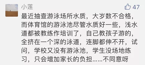 為何將游泳納入必選項(xiàng)?廣東省南粵優(yōu)秀教師、深圳市教學(xué)名師劉晉長期關(guān)注深圳中小學(xué)體育教學(xué)研究,退休前曾是深圳市教科院體育教研員。據(jù)其分析,廣東省開放性水域面廣,學(xué)生溺水事故時(shí)有發(fā)生。避免溺水最好的辦法就是學(xué)會(huì)游泳,將游泳納入體育中考必考選項(xiàng),非常有必要。不僅如此,游泳還對(duì)青少年心肺功能、身體發(fā)育、意志力培養(yǎng)等都有很好的鍛煉,在中小學(xué)普及游泳值得贊同。
