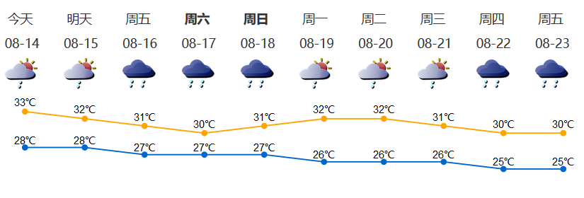 我市今天多云,有短時陣雨或雷陣雨;氣溫28-33℃;西南風(fēng)2-3級;相對濕度70%-90%。