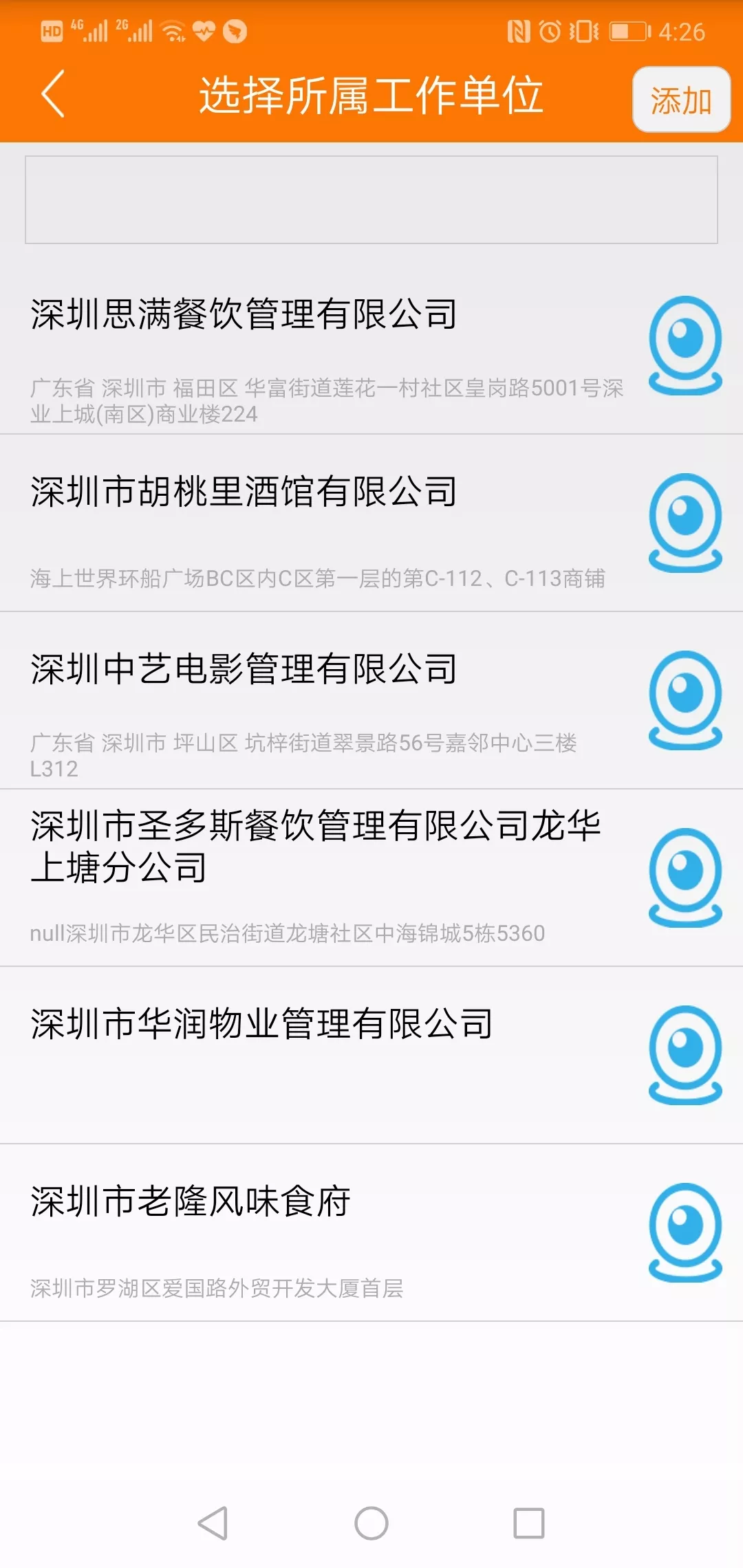 在選擇所屬單位時(shí),可以通過(guò)搜索“名稱(chēng)關(guān)鍵詞”快速查詢(xún),如果沒(méi)有你的餐廳或單位名字,可以點(diǎn)右上角的【添加】來(lái)添加。