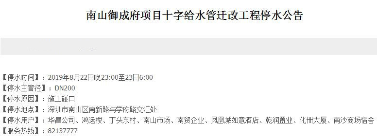 停水時間:2019年8月22日晚23:00至23日6:00