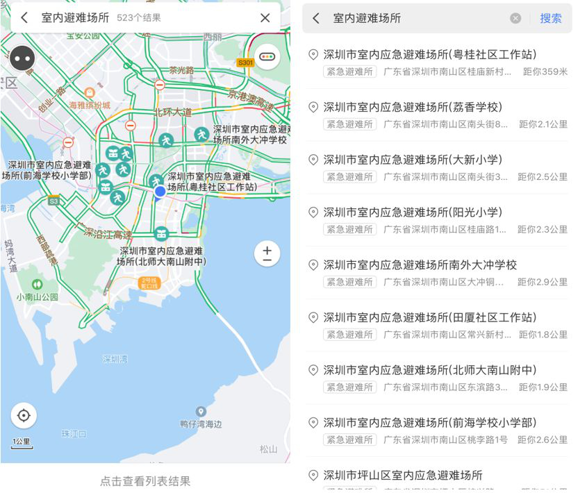 近日,深圳市室內(nèi)應(yīng)急避難場所查詢和導(dǎo)航功能在騰訊地圖上線試運行,大家在"深圳應(yīng)急管理"官方微信公眾號菜單欄"服務(wù)互動"-"應(yīng)急避險"欄目,或在騰訊地圖 APP、"騰訊地圖 +"微信小程序搜索"室內(nèi)應(yīng)急避難場所",便可獲取附近所有應(yīng)急避難場所的位置名稱、地址、緊急聯(lián)系電話等信息: