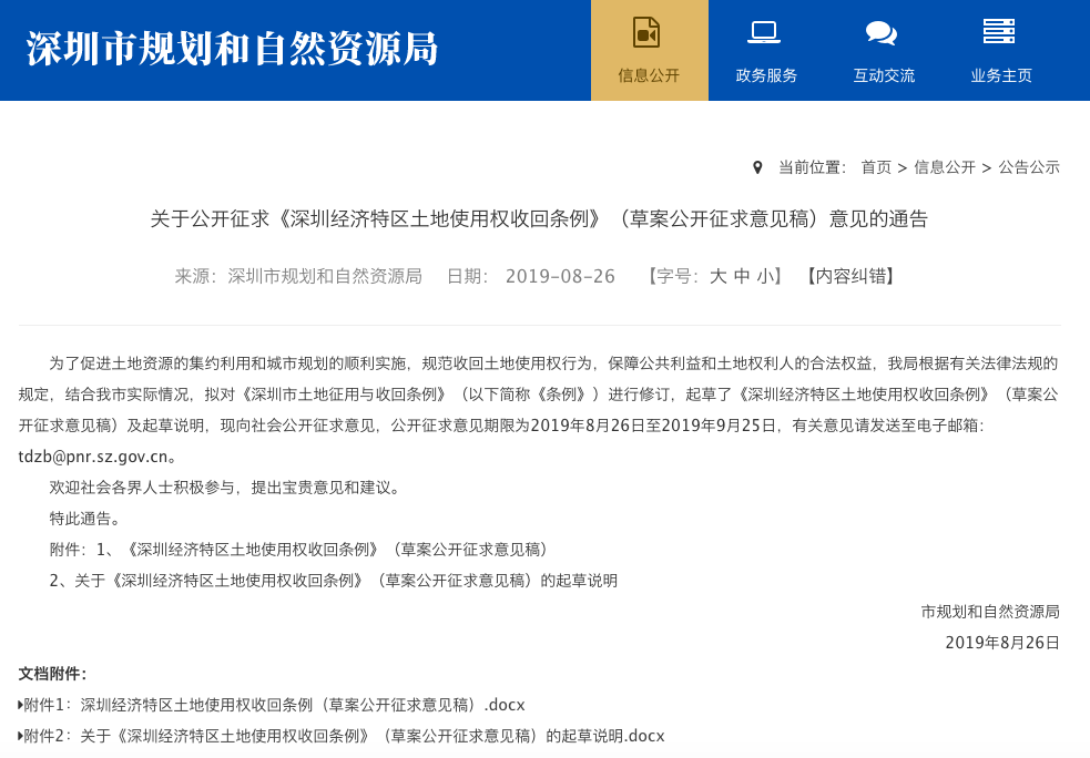 據(jù)了解,目前該《條例》(草案公開征求意見稿)正向社會公開征求意見,公開征求意見期限為2019年8月26日至2019年9月25日,有關意見請發(fā)送至電子郵箱:tdzb@pnr.sz.gov.cn。