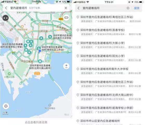目前,深圳市已建成的592處室內(nèi)應(yīng)急避難場所位置信息已經(jīng)標(biāo)注在騰訊地圖上。深圳市民可在騰訊地圖APP端,或在“騰訊地圖+”微信小程序中,搜索“室內(nèi)應(yīng)急避難場所”,獲取附近所有室內(nèi)應(yīng)急避難場所的地理位置、名稱、地址、緊急聯(lián)系電話等信息,同時可一鍵導(dǎo)航,盡快抵達。