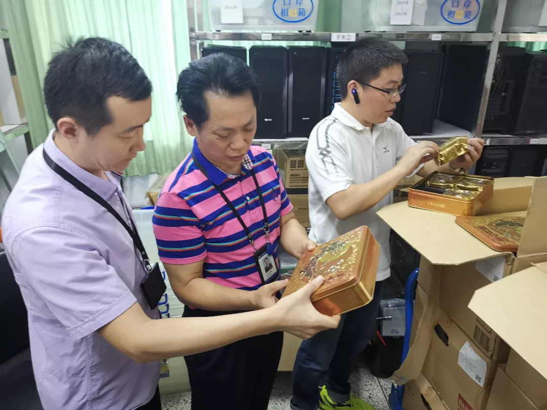 執(zhí)法人員聯(lián)合公安機(jī)關(guān)、商標(biāo)權(quán)利人對涉嫌假冒月餅進(jìn)行鑒定