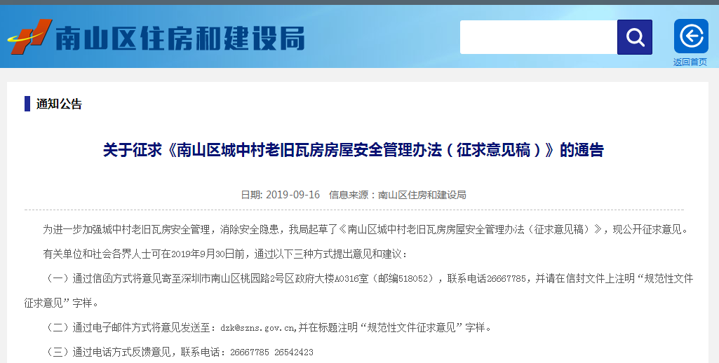 意見稿征集截止至9月30日,有關(guān)單位和社會各界人士有意見或建議的要及時進(jìn)行反饋,更多情況可以登錄南山區(qū)住建局官網(wǎng)進(jìn)行查看。