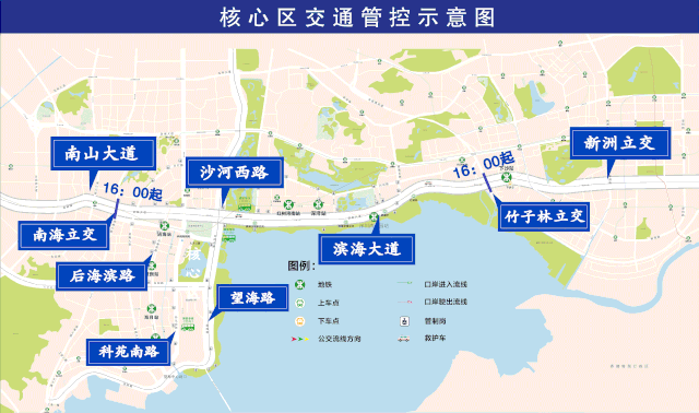 以深圳灣人才公園為中心,濱海大道(南海立交至竹子林立交段雙方向)、沙河西路(濱海大道至東濱立交雙方向)、望海路(東濱立交至中心段雙方向)、中心路(科苑南路至望海路雙方向)、科苑南路(東濱路至中心路段東側(cè))、東濱路(后海濱路至科苑南路段,不含)、后海濱路(濱海大道至東濱路,不含)的合圍區(qū)域?qū)嵤┙煌ü苤疲灰约盀I海大道東往西方向(竹子林立交至南海立交),西往東方向(南海立交至竹子林立交)實(shí)施交通管制。