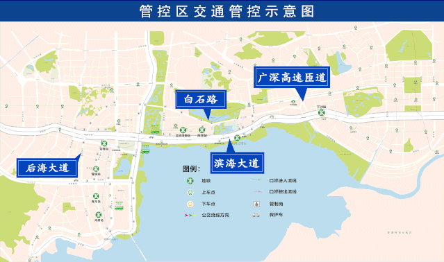 以深圳灣人才公園為中心,濱海大道(南海立交至竹子林立交段雙方向)、沙河西路(濱海大道至東濱立交雙方向)、望海路(東濱立交至中心段雙方向)、中心路(科苑南路至望海路雙方向)、科苑南路(東濱路至中心路段東側(cè))、東濱路(后海濱路至科苑南路段,不含)、后海濱路(濱海大道至東濱路,不含)的合圍區(qū)域?qū)嵤┙煌ü苤疲灰约盀I海大道東往西方向(竹子林立交至南海立交),西往東方向(南海立交至竹子林立交)實(shí)施交通管制。