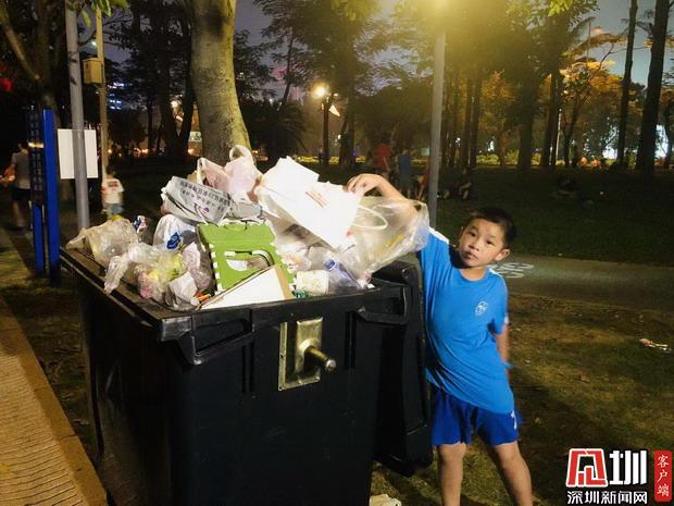 10月1日晚上8:50分,深圳灣公園里,剛剛看完焰火晚會的孩子正將垃圾丟進(jìn)垃圾桶。