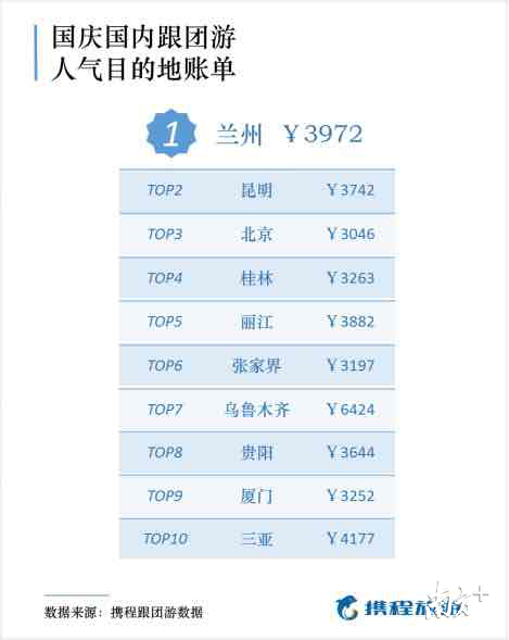 哪些國內(nèi)旅游城市是今年國慶的贏家?根據(jù)攜程跟團(tuán)游,最受游客歡迎的國內(nèi)旅游城市前十分別是蘭州、昆明、北京、桂林、麗江、張家界、烏魯木齊、貴陽、廈門和三亞。其中前往蘭州人均花費(fèi)近4000元。