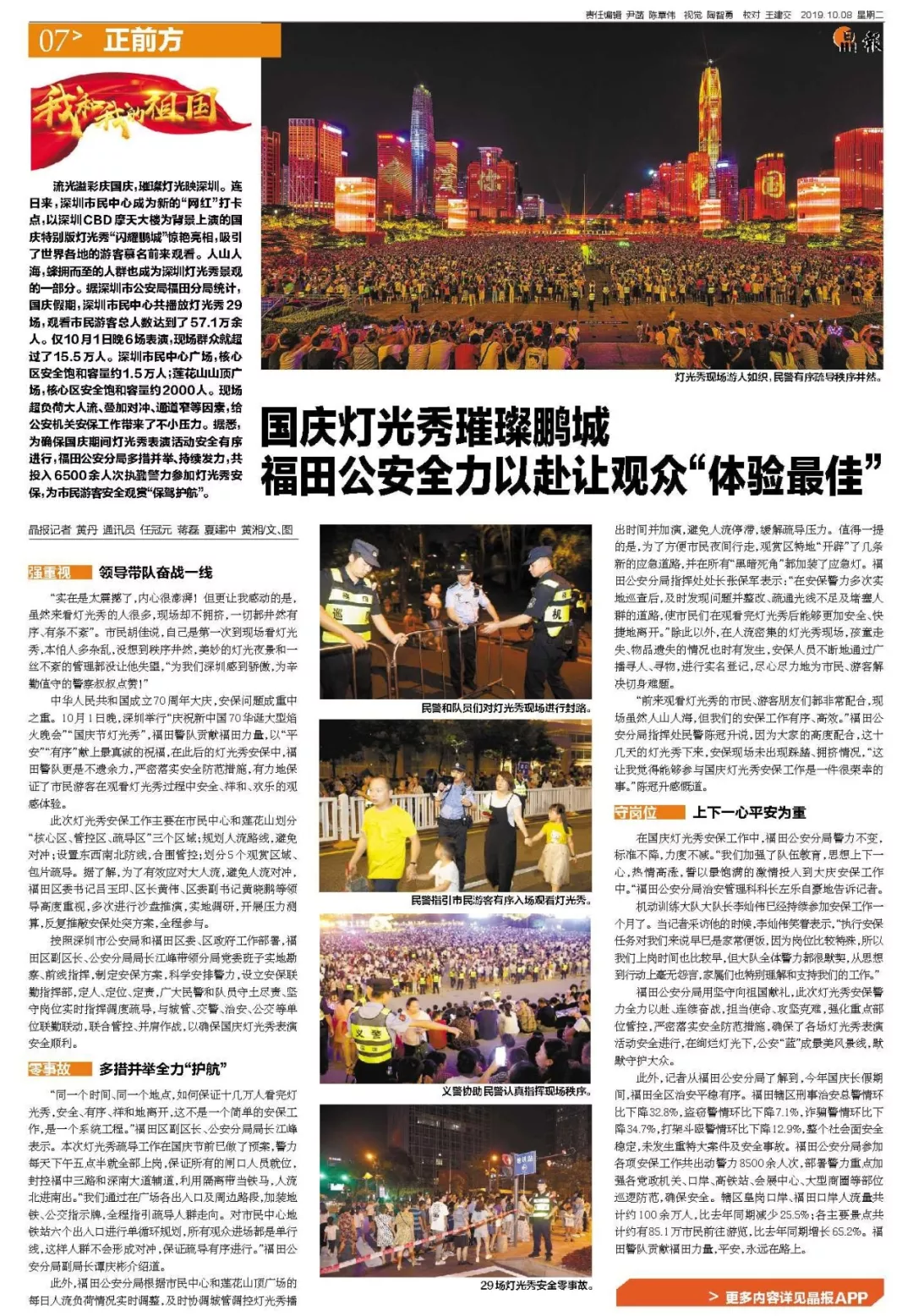 在國慶燈光秀安保工作中,福田公安分局警力不變,標(biāo)準(zhǔn)不降,力度不減?!拔覀兗訌娏岁犖榻逃枷肷舷乱恍?,熱情高漲,誓以最飽滿的激情投入到大慶安保工作中。“福田公安分局治安管理科科長左樂自豪地告訴記者。