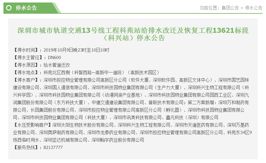10月9日晚23時至10日10時,因給水管道遷改,科苑北區(qū)西側將停水,停水客戶包括中建交通建設集團有限公司、深圳市科技園物業(yè)集團有限公司、深圳市迅美科技有限公司等多個企業(yè)。