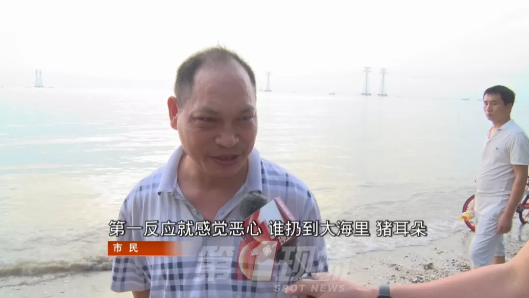 市民郭先生說(shuō),前兩天傍晚,他帶孩子到這里時(shí),就已經(jīng)發(fā)現(xiàn)了這一幕??沙^(guò)48小時(shí)了,海灘上的豬耳朵仍沒(méi)有得到清理。