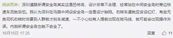 那么,安全島能不能做到相對(duì)更安全呢。目前深圳很多安全島闊度低于1.5米的國(guó)際安全標(biāo)準(zhǔn),一旦難以容納等候過路的行人,車流就會(huì)對(duì)行人構(gòu)成威脅,是不是可以建的更大一些。另外,安全島是不是可以建得更結(jié)實(shí)。不敢說(shuō)一定要能抵擋泥頭車大貨車的洶洶氣勢(shì),至少一般的小汽車如果出現(xiàn)“航向偏差”,我們的安全島可以有效緩沖甚至阻停。