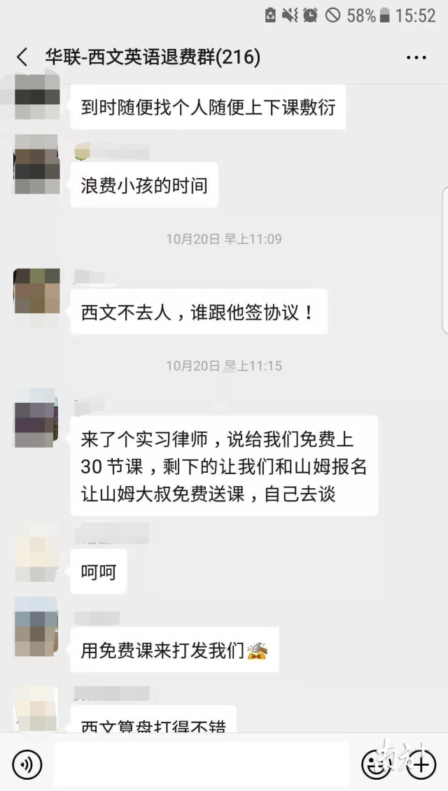 陳先生介紹,消費者自發(fā)組建的“華聯(lián)-英語西文退費群”里,和他有一樣遭遇的還有215人。每人交學(xué)費1-3萬不等,按學(xué)費2萬/人算,涉及學(xué)費至少400萬元。