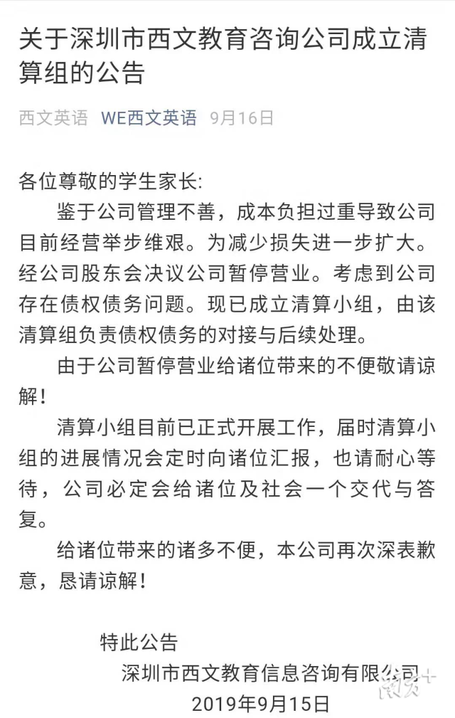 “9月9日時,西文英語還在正常營業(yè),當(dāng)天還收了幾十個學(xué)員的學(xué)費。但第二天就關(guān)門了,貼著告示說暫停營業(yè),毫無預(yù)兆?!标愊壬f。