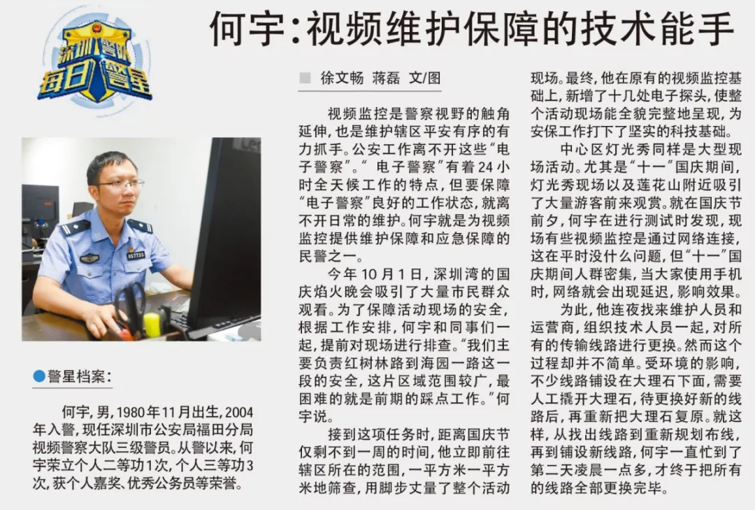 何宇,男,1980年11月出生,2004年入警,現(xiàn)任深圳市公安局福田分局視頻警察大隊(duì)三級(jí)警員。從警以來,何宇榮立個(gè)人二等功1次,個(gè)人三等功3次,獲個(gè)人嘉獎(jiǎng)、優(yōu)秀公務(wù)員等榮譽(yù)。