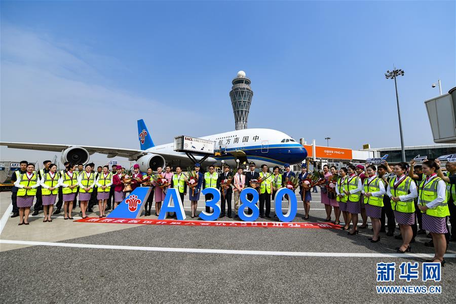 10月27日,機(jī)組、地勤人員等慶??罩锌蛙嘇380客機(jī)重返深圳機(jī)場。當(dāng)日下午,由全球最大寬體客機(jī)——空中客車A380執(zhí)飛的南航CZ3153次航班由深圳起飛前往北京,標(biāo)志著這款“空中巨無霸”機(jī)型重返深圳機(jī)場。南航曾在2014年5月開始啟用A380執(zhí)飛京深航線,后因動態(tài)運力調(diào)配停飛。新華社記者毛思倩攝