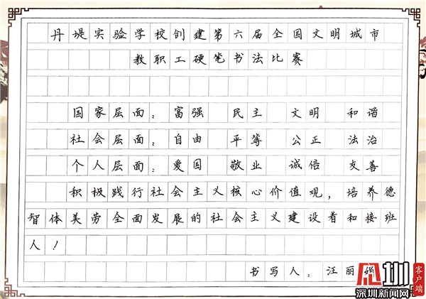 見圳客戶端·深圳新聞網(wǎng)10月29日訊(見圳客戶端、深圳新聞網(wǎng)記者 潘寶儀 通訊員 袁小俊 圖/朱雅琪 ) 為落實立德樹人總目標、培育和踐行社會主義核心價值觀,創(chuàng)建文明城市,積極倡導全校教職工勤練教學基本功,提高教師綜合素養(yǎng),豐富課余生活,展示丹堤實驗學校教職工風采,學校于10月25日舉行了“創(chuàng)建第六屆全國文明城市教職工硬筆書法比賽”。