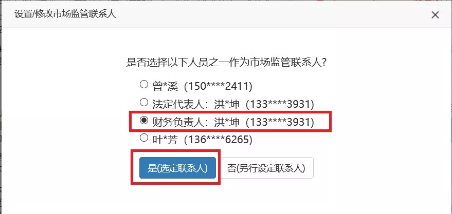 第三步:彈出備選的市場監(jiān)管聯(lián)系人信息,選擇一名,點擊“是(選定聯(lián)系人)”。