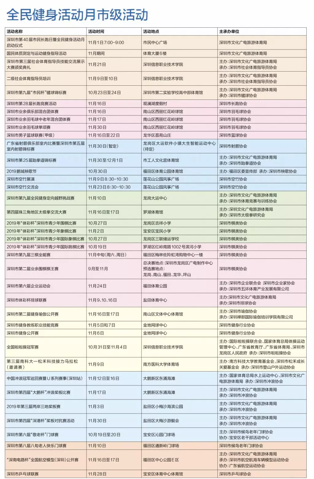 根據(jù)《深圳經(jīng)濟(jì)特區(qū)促進(jìn)全民健身?xiàng)l例》,每年11月是全民健身活動(dòng)月,11月1日是深圳市民長(zhǎng)跑日。上午7時(shí)30分,深圳市副市長(zhǎng)吳以環(huán)宣布活動(dòng)開(kāi)始并鳴槍起跑,與2000多名干部職工一起,以實(shí)際行動(dòng)宣傳、踐行全民健身。