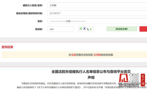 張偉律師通過(guò)平臺(tái)查詢的結(jié)果顯示,王思聰目前未列入失信被執(zhí)行人名單