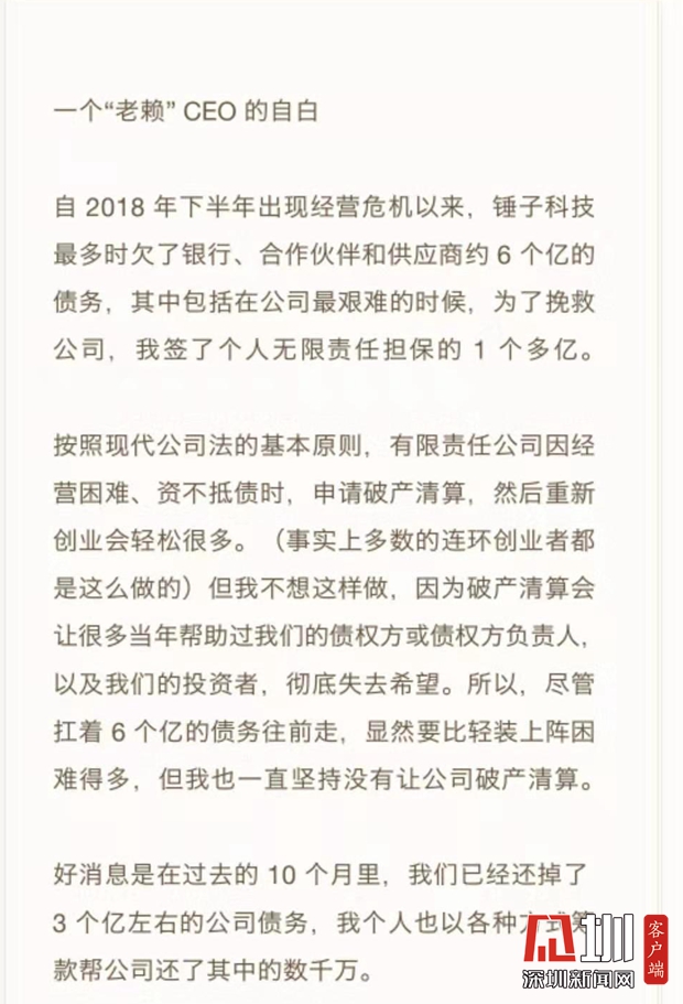 再早幾天,錘子科技CEO羅永浩進(jìn)入失信人名單,被丹陽(yáng)法院下了限制消費(fèi)令。羅永浩隨后在自己的個(gè)人公眾號(hào)上發(fā)布了《一個(gè)“老賴”CEO的自白》,稱自己為了挽救公司,簽了個(gè)人無(wú)限責(zé)任擔(dān)保的1個(gè)多億,強(qiáng)調(diào)會(huì)把債務(wù)全部還完。