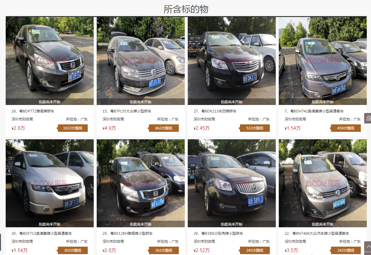 13日,晶報APP記者登錄京東網(wǎng)絡(luò)拍賣平臺,已經(jīng)可以看到這批拍賣車輛的信息。其中,第二場標(biāo)的序號40(粵B327KW奧德賽牌小型普通客車)、標(biāo)的序號49(粵B08566豐田牌小型轎車)已撤拍。
