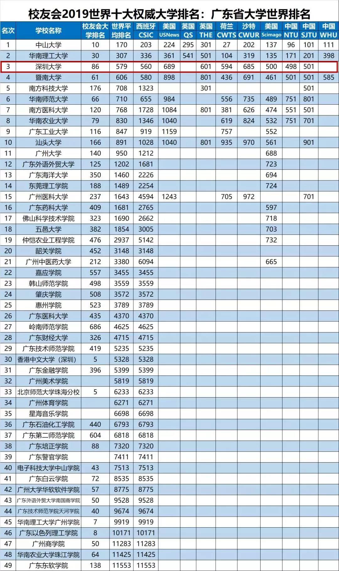 報(bào)告顯示,在全球公認(rèn)的英國QS、英國THE、美國USNews、美國Scimago、西班牙CSIC、荷蘭CWTS、沙特CWUR、中國NTU、中國SJTU和中國WHU等2018-2019世界十大權(quán)威大學(xué)排名中,中山大學(xué)、華南理工大學(xué)、深圳大學(xué)名列2019廣東省大學(xué)排名前3強(qiáng)。