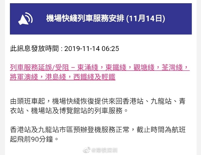 見圳客戶端·深圳新聞網(wǎng)2019年11月14日訊 過關香港的旅客注意:今天(14日)凌晨5:05分,港鐵發(fā)通知調(diào)整列車運營服務時間。