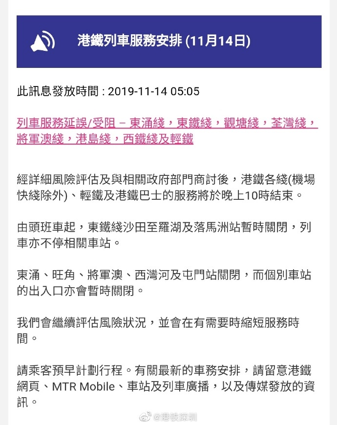 據(jù)港鐵官網(wǎng)目前最新消息,11月14日,港鐵各線(機場快線除外)、輕鐵及港鐵巴士的服務將于晚上10時結束,東涌線、東鐵線、觀塘線、荃灣線、將軍澳線、港島線、西鐵線及輕鐵列車服務延誤/受阻。
