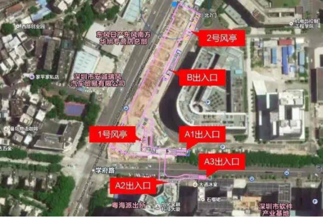 深大南站位于學(xué)府路與白石路交界處北側(cè),車站出入口共計4個:A1出入口、A2出入口、A3出入口、B出入口,其中A1出入口位于深圳大學(xué)基礎(chǔ)實(shí)驗(yàn)樓一期南側(cè),B出入口位于深圳大學(xué)基礎(chǔ)實(shí)驗(yàn)樓一期西側(cè)