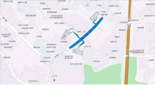 南油西站位于東濱路與南光路交叉口上,車站出入口共計3個,A出入口位于匯賓廣場東側,C出入口位于永新時代廣場的西側,D出入口位于南光路與東濱路交匯處北側