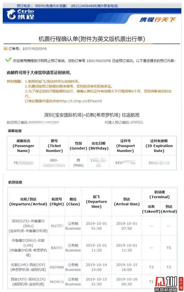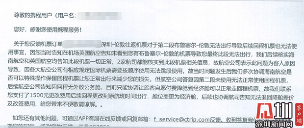 近日,葉先生向深圳新聞網(wǎng)記者爆料稱,他于今年8月份通過(guò)攜程網(wǎng)購(gòu)買國(guó)慶期間深圳往返倫敦的機(jī)票,但轉(zhuǎn)機(jī)時(shí)卻因查不到登機(jī)信息導(dǎo)致滯留機(jī)場(chǎng),又因航司規(guī)定被剝奪返程機(jī)票的使用權(quán)。事后,葉先生反復(fù)與平臺(tái)及航司溝通要求說(shuō)明事件原因并要求賠償,但目前事件尚未完全解決。