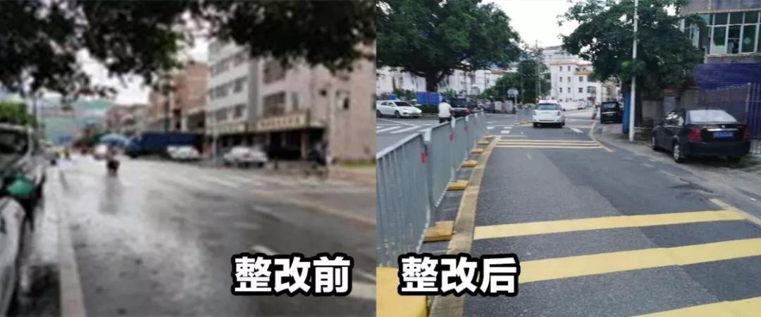 沙坑二路學(xué)校周邊路口整改前后對(duì)比。在今年新開學(xué)的竹坑、錦龍等學(xué)校周邊也完善了減速帶、限速標(biāo)志、反光鏡等設(shè)施,不但限制了車輛行駛速度,也消除了路口交會(huì)處的視覺盲區(qū)