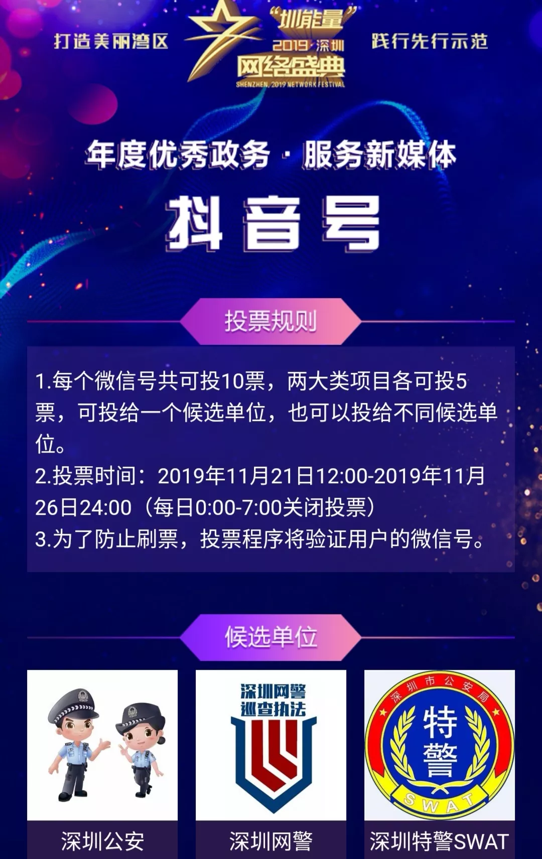 2.投票時(shí)間:2019年11月21日12:00-2019年11月26日24:00(每日0:00-7:00關(guān)閉投票)