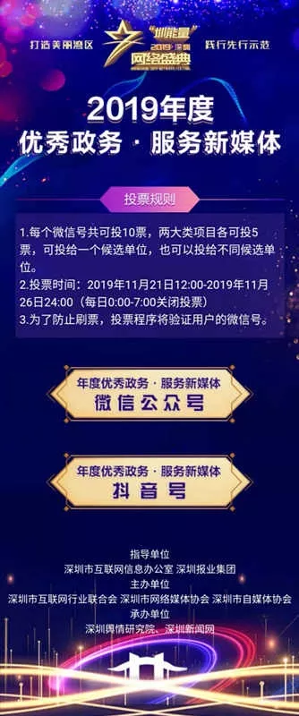 為盤點(diǎn)行業(yè)一年來取得的新探索、新成就、新經(jīng)驗(yàn),唱響主旋律,弘揚(yáng)正能量,“‘圳能量’2019深圳網(wǎng)絡(luò)盛典”——暨深圳年度優(yōu)秀政務(wù)·服務(wù)新媒體活動(dòng)將于2019年12月6日隆重舉行。