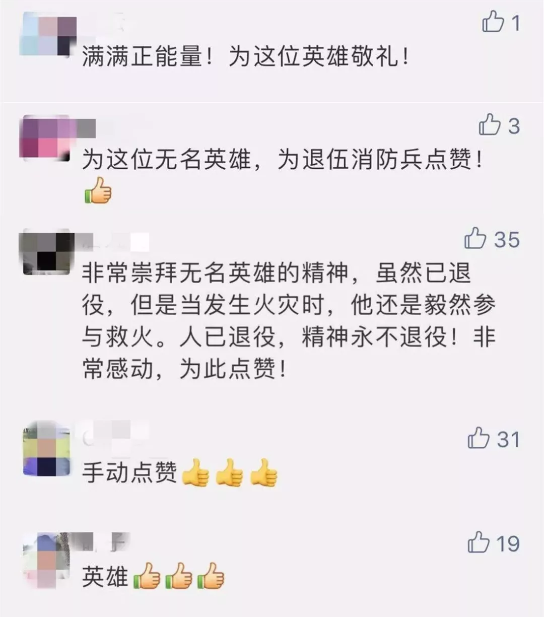 在文章的留言中,網(wǎng)友紛紛為這位救火的英雄手動(dòng)點(diǎn)贊:“英雄!好樣的!”“退伍不褪色”。